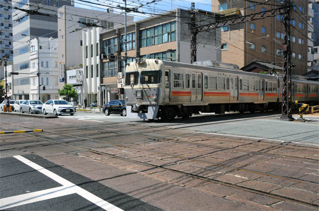 市内環状線の中に古町で入り込んできた高浜線は、環状線の外にある松山市駅へ向かうため、もう一度交差する。そこが大手町の交差点だ。全国的にはこちらの方が有名で、路面電車と郊外電車の複線どうしが、ほぼ直角に交差することで評判の場所。道路に綺麗なダイアモンドクロッシングが描かれる。上を見上げると架線もダイアモンドクロスになっている。架線同士が繋がっているということは、郊外電車も市内電車も同じ600Vで走っていることを意味する。低電圧の郊外電車だ。